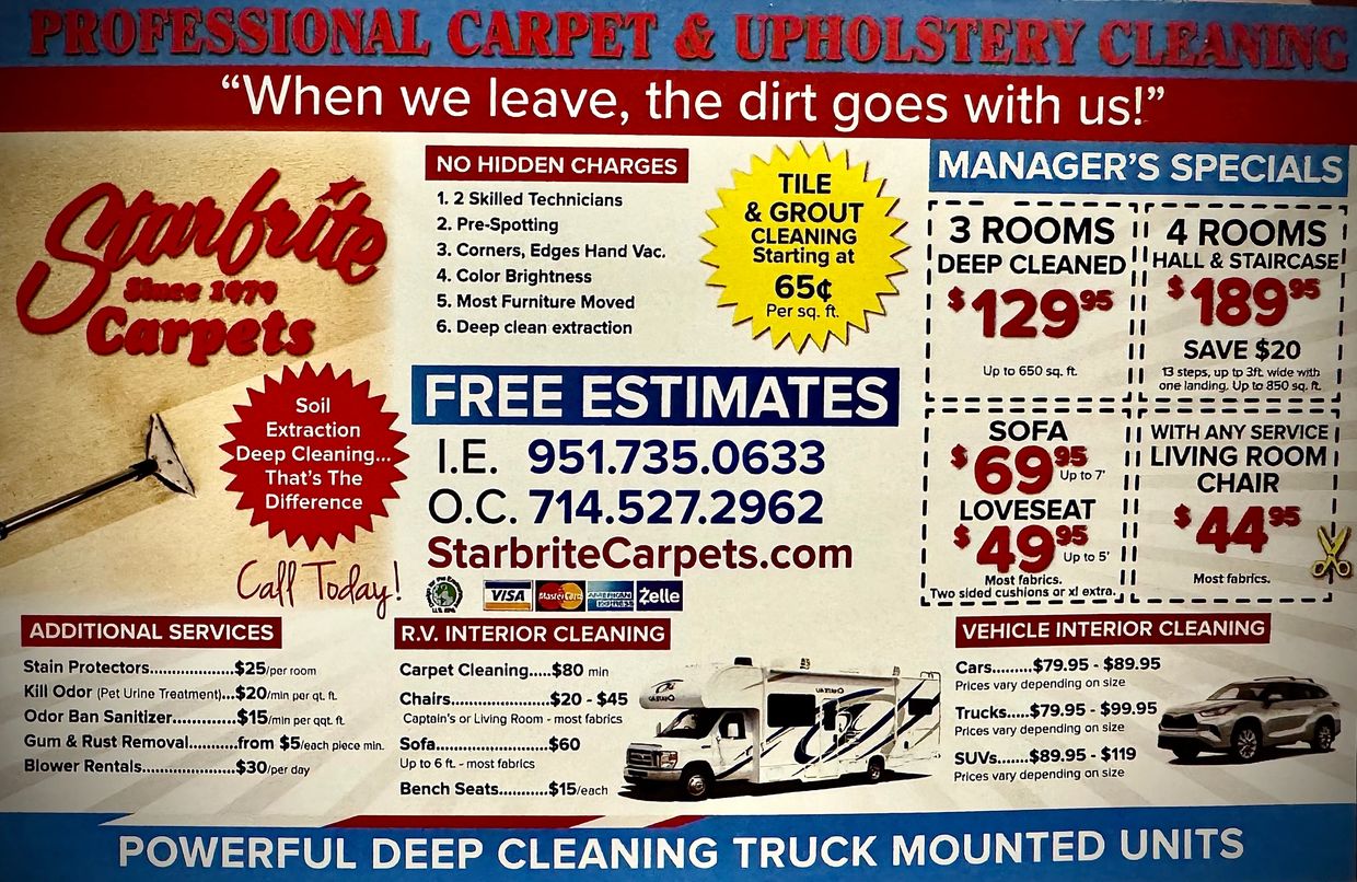 Starbrite Carpets and Upholstetry Cleaning uses exclusive truck mounted units and new generation stain master approved certified cleaners required by YOUR carpet manufacturers cleaning guidelines such as Shaw and Mohawk Industries.
